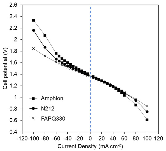 Figure 4 shows the polarization curves at 50% SoC for the cell assembled with the three selected membranes: N212, FAPQ330 and Amphion. It is noteworthy that in all the cases, the registered OCV is close to the theoretical 1.40 V as calculated from the Nernst equation (Table S1), for these cell conditions [17]. For all the membranes, linearity between potential and current density remains up to 40 mA cm−2 (Figure S5). This indicates that the performance at 50% SoC is governed by the ohmic resistance loss range up to 40 mA cm−2. Above this value, efficiency losses ascribed to mass transfer limitation become more pronounced. In addition, a slight difference in the resistance of the cell is observed, as perceived from the changes in the slope of the polarization curves. These results correlate well with the different ASR values calculated from the PEIS measurements during the conditioning of the cell prior to the cycle at OCV (Figure S6, Table S2). The highest internal resistance is measured for the cell equipped with Amphion, 2.01 ± 0.19 Ωcm2, followed by 1.10 ± 0.05 Ωcm2 with FAPQ330 and 0.99 ± 0.11 Ωcm2 with N212. At the same time, these results are in good agreement with those reported for the through-plane conductivity (Table 1). This shows that the internal cell resistance can be directly related to the conductivity of the immersed membrane in the POM electrolyte. Even though the obtained ASRs are higher than typical ASRs for VRFBs (0.5 Ωcm2), the values are still lower than those commonly seen in non-aqueous RFBs (up to 5 Ωcm2) [7], and within the targets established for an efficient operational RFB (0.29–2.3 Ωcm2) [55].