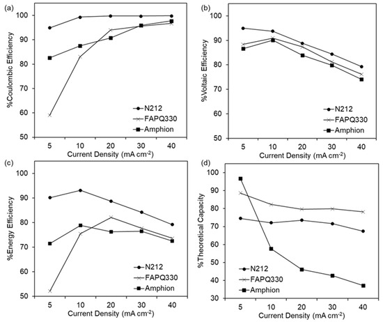 During the cycling test, the effect of the current density on the efficiency and capacity was evaluated (Figure 5). Above 5 mA cm−2, the CE is close to 100% for N212 (99.8%), while for FAPQ330 and Amphion, there is an increase with the current density. The CE for FAPQ330 increases from 58.9% at 5 mA cm−2 to 96.8% at 40 mA cm−2, and for Amphion from 82.6% to 97.8%. This increasing trend can be attributed to the crossover, as the CE is especially low at low current densities, when the cycles are long-lasting and, consequently, there is more time for the species to pass through the membrane. In contrast, the VE shows the opposite trend; it decreases with increasing current density due to the higher ohmic losses. For the cell assembled with N212, a VE loss of 15.1% can be observed upon going from 5 mA cm−2 to 40 mA cm−2. This is similar to the drop seen for Amphion (15.9%) and for FAPQ330 (17.3%). As a result, the EE registered for N212 is higher at all current densities due to its superior CE, reaching its maximum at 10 mA cm−2 (93.1%). FAPQ330 has its highest efficiency at 20 mA cm−2 (82.1%), and Amphion stabilizes close to 80% between 10 and 30 mA cm−2. Looking at the discharge capacity, N212 and FAPQ330 show a similar performance, with the capacity remaining constant at each current density at 75% for N212 and 80% of the theoretical capacity for FAPQ330. In contrast, Amphion shows a significant drop from 96.7% at 5 mA cm−2 to 57.7% at 10 mA cm−2 and only uses 37.2% of the theoretical capacity at 40 mA cm−2.