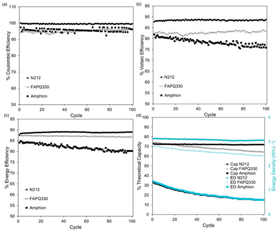 The long-term cyclability results for all membranes are depicted in Figure 6. Here, a current density of 20 mA cm−2 was chosen based on the previously presented results, as this current density displayed a good trade-off between the EE and the cycle time. Again, the performance for N212 is remarkable, with a constant EE of 89% over 100 cycles and an energy density of 3.1 Wh L−1 after 100 cycles. This can be translated into a capacity retention of 98.9%, or in other words, a capacity fade of 0.01% per cycle, as reported in our previous work [17]. The system equipped with FAPQ330 exhibited a constant EE over 100 cycles of 87.2% and an energy density of 2.4 Wh L−1 at the end of the durability test. However, the capacity retention for this membrane is 86.0%, which translates into a capacity fade of 0.14% per cycle. For Amphion, the EE shows more fading; it decreases from 82.0% at the beginning of the test to 75.9% after 100 cycles, which can be mainly associated with the decreasing capacity, resulting in a more significant mass transfer overpotential limitation that reduces the VE, as confirmed in Figure 6b. This is also reflected in the lower energy density, 0.6 Wh L−1 after 100 cycles, with only 44.0% capacity retention, or in other words, with a capacity fade of 0.26% per cycle.