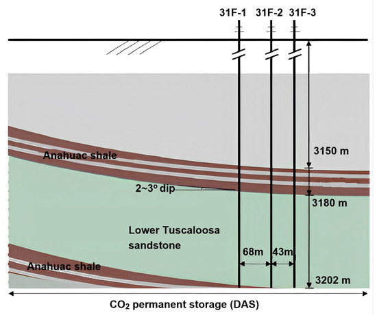 On 1 December 2009, the Southeast Regional Carbon Sequestration Partnership (SECARB) augmented the existing operations by deploying an additional injection well (31F-1) along with two monitoring wells (31F-2 and 31F-3) in the Deep Aquifer Storage (DAS) area, located approximately 300 m east of the Cranfield EOR operations (as illustrated in Figure 1). During the DAS injection project initiated in 2009, about 500,000 tons of CO2 were injected, resulting in significant insights into reservoir behavior. Notably, the maximum temperature drop observed in the reservoir due to CO2 injection was approximately 55 °C, indicating the thermal dynamics associated with the injection process. This project not only contributed to oil recovery but also provided valuable data on CO2 behavior and storage potential in geological formations, thereby advancing understanding of CO2 sequestration technologies.