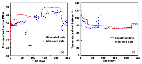 Comparison between the simulated and measured pressure (a) and temperature (b) at the injection well bottom.