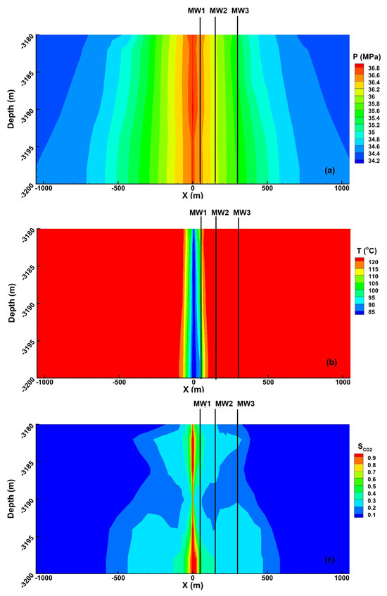 The distribution of (a) pressure, (b) temperature, and (c) CO2 saturation in the reservoir after 1552 days of injection (three black solid lines represent the monitoring wells).