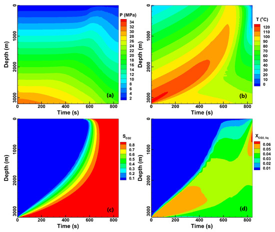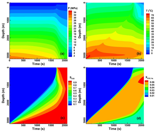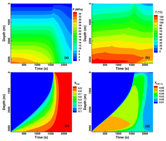 The profile evolution of (a) pressure, (b) temperature, (c) CO2 saturation, and (d) mass fraction of CO2 in the aqueous phase in the MW3 well.