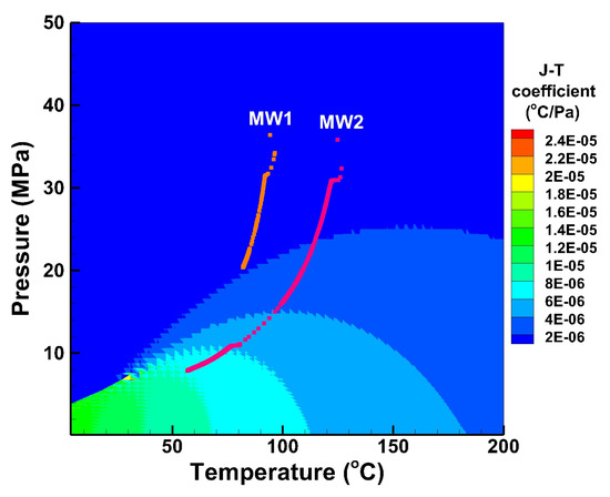 Pressure–temperature evolution at the well bottom of MW1 and MW2, with the background of Joule–Thomson coefficient distribution of CO2.