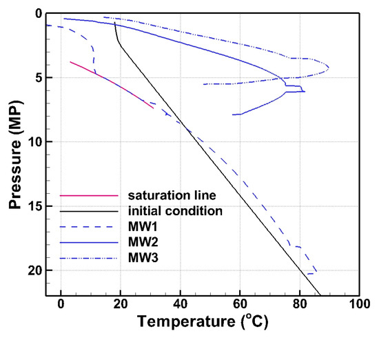 The monitoring wellbores are initially filled with water, where the hot water at the bottom flows up and increases the temperature of the upper part of the wellbore. When CO2 displaces the water, the temperature of the mixture drops rapidly. Figure 11 shows the temperature-versus-pressure (T–P) profiles along different monitoring wells after being filled with CO2. From the T–P curve of MW1, it can be observed that the fluid pressure in the lower part of the wellbore is slightly higher than the hydrostatic pressure but remains close to it; in contrast, the fluid pressure in the upper part of the wellbore gradually deviates from the initial hydrostatic condition. The fluid temperature generally decreases as it flows upward along the wellbore due to heat exchange and the Joule–Thomson effect. Notably, only the T–P profile of MW1 reaches the CO2 saturation line, follows it for a period, leading to an additional temperature drop, and then crosses the line, transitioning entirely into gas.