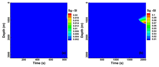 The profile evolution of Sg × Sl in the MW1 well; (a) base model and (b) geothermal gradient reduced by half to 16.2 °C/km.