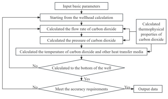 The coupled temperature and pressure field model is solved using numerical methods. The continuity equation, pressure drop equation, and heat transfer equation are discretized using a combination of upwind schemes and central difference methods, resulting in corresponding implicit discrete equations. The calculations begin at the wellhead and extend down to the well bottom, where the continuity equation calculates flow velocity, the pressure drop equation computes pressure, and the heat transfer equation determines temperature. Whenever the pressure drop or heat transfer equation is calculated, the Refprop program module is used to update the physical parameters of CO2 and recalculate the data of its influence (such as convective heat transfer coefficient and friction heat generation). This process is iteratively repeated, and after each iteration, the difference between the current results and the previous iteration is calculated. The solving process concludes when the maximum difference at each depth node meets the specified accuracy requirements. The model solution workflow is illustrated in Figure 2.
