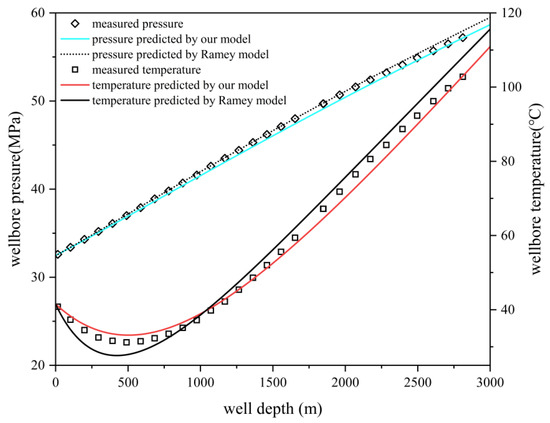 The measured wellbore temperature and pressure data and the comparison of the prediction results of the two models (our model and Ramey model).