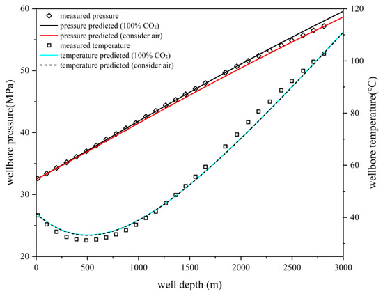 In order to verify that considering lighter components makes the pressure prediction value lower rather than the difference of the model, our model is used to calculate the wellbore temperature and pressure at 100% CO2 and compare it with the previous results. This can also explore the influence of component differences on the prediction results. The results of the model considering the influence of air in CO2 are shown in Figure 4. It can be seen that the pressure predicted by our model without considering impurities is very close to the prediction results of the Ramey model in Figure 3, which is greater than the pressure predicted after considering air. Obviously, when the model predicts the wellbore temperature and pressure, considering the influence of impurities is more in line with the actual situation, and it can also obtain higher bottom hole pressure prediction accuracy. It can be seen from Figure 4 that whether the air is considered has little effect on the predicted temperature of the model. In addition, after CO2 is injected into the reservoir, the production well will produce a large amount of associated gas rich in CO2, and the reinjection of this associated gas into the reservoir through the reinjection well is also a part of CCUS. When these associated gases are reinjected after treatment, the content of alkanes in the reinjected gas is higher, and the influence of alkanes on the model prediction needs to be further discussed.