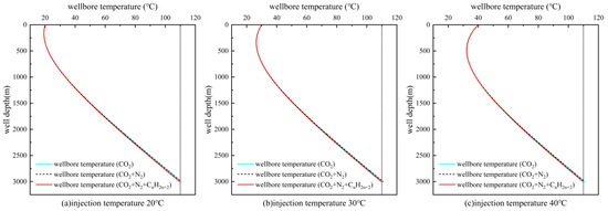 The temperature distribution of the fluid in the tubing with three kinds of CO2 components at different injection temperatures: (a) the temperature distribution of the fluid in the tubing with three kinds of CO2 components at an injection temperature of 20 °C; (b) the temperature distribution of the fluid in the tubing with three kinds of CO2 components at an injection temperature of 30 °C; (c) the temperature distribution of the fluid in the tubing with three kinds of CO2 components at an injection temperature of 40 °C.