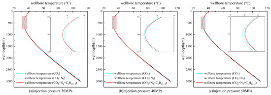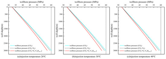 Figure 5 shows the temperature distribution of the fluid in the tubing with three CO2 components at different injection temperatures. As shown in Figure 5, the difference of temperature curves of different components at each injection temperature is very small. It can be seen that even if the injection temperature is changed, the influence of the difference of gas components on wellbore temperature is still very small. The injection temperature can significantly affect the temperature of the wellbore near the wellhead, but the degree of influence decreases with the increase in depth. At the depth close to the bottom hole, there is almost no difference in the temperature curves of different injection temperatures, indicating that the injection temperature has little effect on the bottom hole temperature. The reason why the injection temperature has little effect on the bottom hole temperature is that the injection rate is low, the CO2 is fully heated by the formation, and the temperature difference is not large after reaching the reservoir. When the injection rate is high (e.g., CO2 fracturing), the injection temperature can significantly affect the bottom hole temperature, which can be seen in reference [29]. In addition, it can be observed in Figure 5 that the wellbore temperature increases first and then decreases with the increase in depth. This occurs because when the injection temperature is higher than the surface temperature, the deeper formation temperatures are lower, resulting in the CO2 being cooled first and then heated as it travels down the wellbore.
