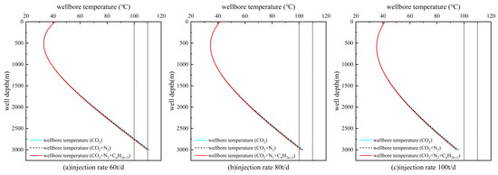 The temperature distribution of the fluid in the tubing with three kinds of CO2 components at different injection rates: (a) the temperature distribution of the fluid in the tubing with three kinds of CO2 components at an injection rate of 60 t/d; (b) the temperature distribution of the fluid in the tubing with three kinds of CO2 components at an injection rate of 80 t/d; (c) the temperature distribution of the fluid in the tubing with three kinds of CO2 components at an injection rate of 100 t/d.
