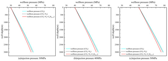 The pressure distribution of the fluid in the tubing with three kinds of CO2 components at different injection pressures: (a) the pressure distribution of the fluid in the tubing with three kinds of CO2 components at an injection pressure of 30 MPa; (b) the pressure distribution of the fluid in the tubing with three kinds of CO2 components at an injection pressure of 40 MPa; (c) the pressure distribution of the fluid in the tubing with three kinds of CO2 components at an injection pressure of 50 MPa.