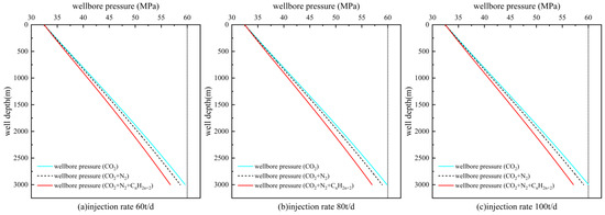 The pressure distribution of the fluid in the tubing with three kinds of CO2 components at different injection rates: (a) the pressure distribution of the fluid in the tubing with three kinds of CO2 components at an injection rate of 60 t/d; (b) the pressure distribution of the fluid in the tubing with three kinds of CO2 components at an injection rate of 80 t/d; (c) the pressure distribution of the fluid in the tubing with three kinds of CO2 components at an injection rate of 100 t/d.