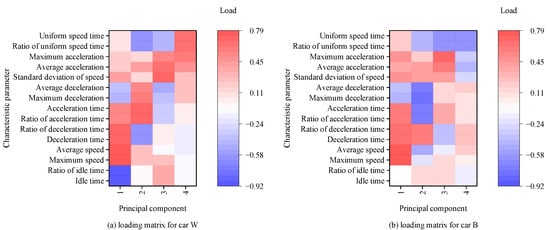 The key characteristic parameters were determined according to the principal component loading matrix in Figure 3a. The first principal component represents average speed and maximum speed; the second principal component represents acceleration time and the ratio of acceleration time; the third principal component represents the standard deviation of speed and average acceleration; the fourth principal component represents uniform speed time and the ratio of uniform speed time. To simplify the model inputs, the average speed and acceleration time were selected as the final parameters for each segment in our study. As for car B, average speed and deceleration time were selected according to Figure 3b.