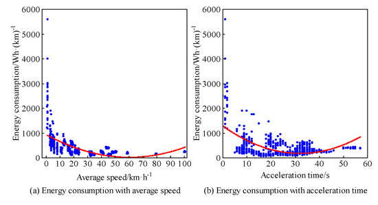 According to the results of the principal component analysis above, this study analyzed the effect of average speed and acceleration time on the segment EC. Figure 4a shows the variation of the segment total EC with average speed, the scatters fitted with a quadratic term. It can be seen that there was a trend of EC decreasing and then increasing with increasing average speed. When the average speed was in the interval of 0–20 km·h−1, the distribution of the EC is much higher and more dispersed, with the average EC achieving 646.57 Wh·(km)−1. As the average speed increased and reached the economic interval of 20–60 km·h−1, the EC reached its lowest level, only 204.83 Wh·(km)−1. On average, the EC was 3.16 times larger at low-speed intervals than in the medium-speed intervals. This phenomenon was due mainly to the increased time of drive motor operation in the low-efficiency zone and the greater EC from the low-temperature air-conditioning system at the initial stages.