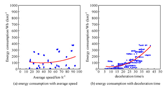Figure 4b shows the variation of EC with acceleration time, the scatters also fitted with a quadratic term. It is obvious that the EC trend was similar to that with average speed. The reasons are as follows: when the acceleration time is short, the road traffic is congested, thus being equal to the condition of low average speed; when the acceleration time is appropriately extended, the vehicle operates for more time in the economic zone with the lowest EC; as the acceleration time is extended again and the vehicle reaches a high speed, the EC increases cause the motor to leave the optimal working point, and the air resistance increases significantly, which forces the motor to run under a high load.