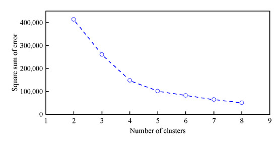 The number of clustering categories k is determined according to the elbow method. The point where the steep declining trend in the sum of squared error begins to slow down is called the “elbow inflection point”, and there is no longer a significant decrease in the sum of squared error with increasing numbers of clustering categories after this point (here, k was selected as 4, as shown in Figure 6).