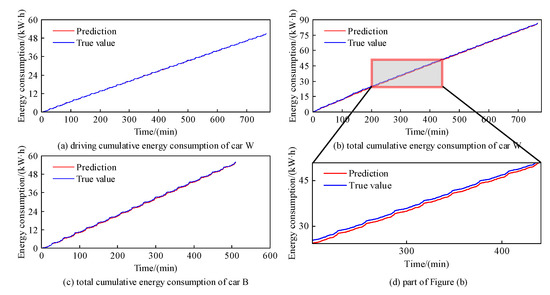 (a) Prediction results of the cumulative driving energy consumption of car W, (b) the cumulative total energy consumption of car W, and (c) the cumulative total energy consumption of car B; (d) an enlarged part of the cumulative total energy consumption prediction for car W.