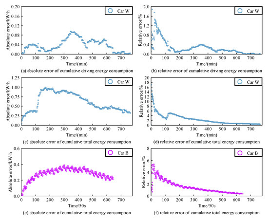 (a) Absolute error of cumulative driving energy consumption prediction from car W, (b) relative error of cumulative driving energy consumption prediction from car W, (c) absolute error of cumulative total energy consumption prediction from car W, (d) relative error of cumulative total energy consumption prediction from car W, (e) absolute error of cumulative total energy consumption prediction from car B, and (f) relative error of cumulative total energy consumption prediction from car B.