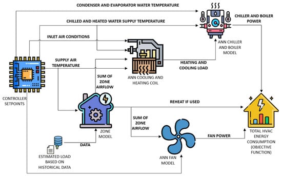 - Hosamo, H.; Hosamo, M.H.; Nielsen, H.K.; Svennevig, P.R.; Svidt, K. Digital Twin of HVAC System (HVACDT) for Multiobjective Optimization of Energy Consumption and Thermal Comfort Based on BIM Framework with ANN-MOGA. Adv. Build. Energy Res. 2023, 17, 125–171. [Google Scholar] [CrossRef]