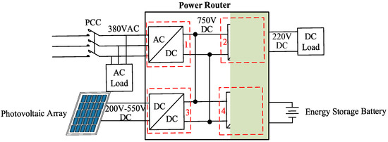 A power router (PR) is a highly integrated power electronic conversion device that combines information flow and power flow. It features universality, openness, and compatibility, and is capable of managing, dispatching, and distributing energy at various scales, from household to industrial park to power grid levels. It simultaneously meets the demands of local energy consumption, grid connection, and sharing requirements, achieving a comprehensive utilization of “source-grid-load-storage” integration [1,2,3,4].