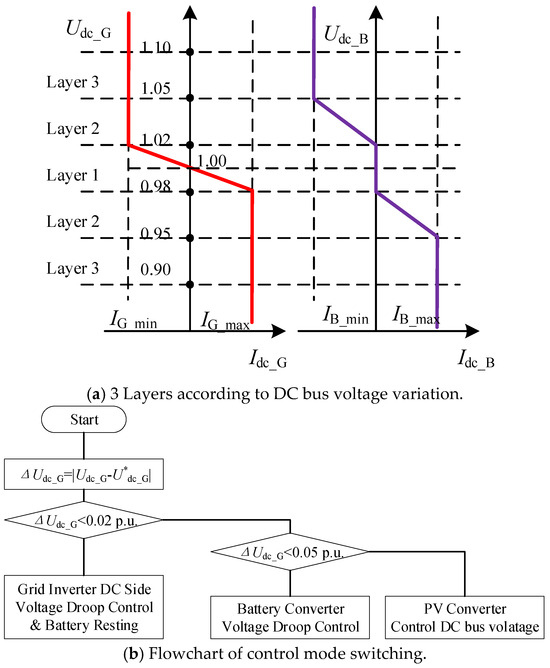 Figure 4 shows a diagram of the voltage hierarchical droop control characteristic adopted in this paper, where Udc_G and Udc_B represent the power source external characteristics of the grid-connected unit inverter and energy storage unit bidirectional energy storage converter in different layers, respectively. In the figure, the horizontal axis represents the converter output current, while the vertical axis represents DC bus voltage variations, with the voltage variations shown in per-unit values. In the diagram, a positive current direction indicates that the grid-connected unit inverter and energy storage unit bidirectional energy storage converter are supplying power to the PR DC bus, while a negative current direction indicates they are absorbing power from the DC bus.