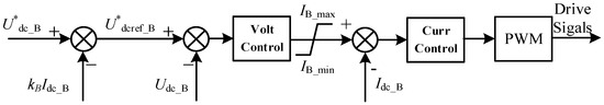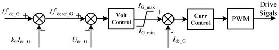 In this equation, kG is the inverter droop coefficient, where kG = 0.02/IG_max, where IG_max represents the maximum DC-side current of the inverter; U*dc_G is the voltage reference value in the first layer control. In this paper’s first layer control U*dc_G = 750 V. The inverter’s control loop at this time is shown in Figure 5.
