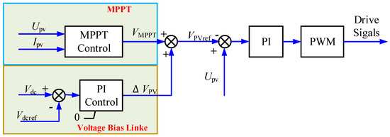 The control loop for the photovoltaic converter power curtailment operation is shown in Figure 8. ΔVPV is added to the traditional MPPT control output VMPPT. At this time, due to the high photovoltaic power and low system power consumption, bus power imbalance leads to an increase in voltage; namely, Vdc > Vdcref occurs, requiring a reduction in photovoltaic power. The difference between the DC bus voltage Vdc and the photovoltaic unit constant voltage reference value Vdcref is processed through a PI controller and superimposed with MPPT control output. At this time, the PI controller output is positive, which will control the photovoltaic array to work in the downward slope region, reducing the photovoltaic output power and controlling the system DC bus voltage at the Vdcref value. In the third layer control, Vdcref is set to 1.075 pu.