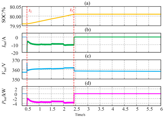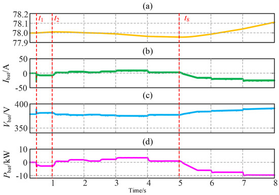 At the start of the simulation, the grid-connected unit inverter starts and establishes a DC bus voltage of 750 V. At t1 = 0.5 s, the energy storage unit starts, with a battery SOC at 79.96%, below 80%. The bidirectional energy storage converter begins charging the battery with a charging power of approximately 4 kW, and the battery SOC gradually increases. As shown in Figure 10a, the DC bus voltage decreases from 750 V to 742 V under droop control. At t2 = 1 s, the DC load unit starts with no load, establishing an output voltage of 220 V, with the bus voltage remaining essentially constant. At t3 = 1.5 s, the DC load unit suddenly increases the load to 0.5 kW, causing the DC bus voltage to slightly decrease and the battery charging power to reduce.