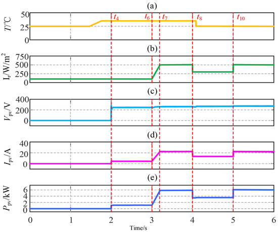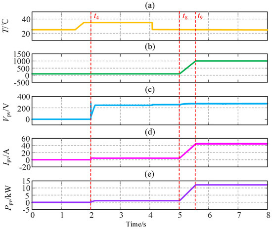 Photovoltaic Unit output waveforms in power curtailment operation mode: (a) ambient temperature; (b) light intensity; (c) photovoltaic voltage; (d) photovoltaic current; (e) photovoltaic power.