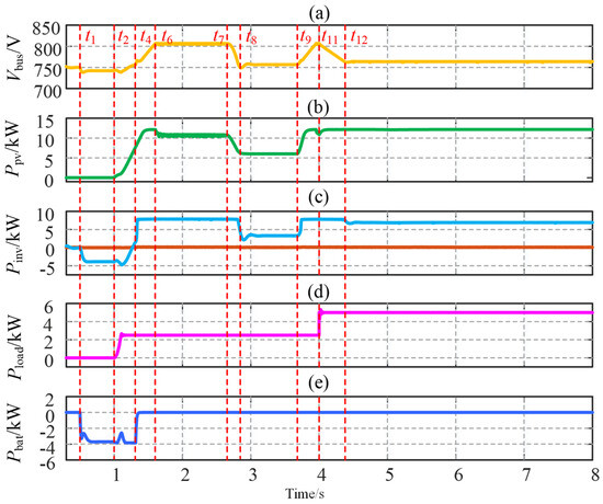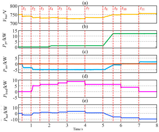At t3 = 1.5 s, the DC load increases by 1.25 kW. Due to power limitation on the grid-connected unit inverter, power absorbed from the grid is insufficient to meet the load power demand. At this time, the power deficit is supplied by the energy storage unit. As shown in Figure 13e, the energy storage unit begins to input power to the DC bus. At t4 = 2 s, the photovoltaic unit begins operation with a relatively low light intensity of only 100 W/m², resulting in a photovoltaic output of only around 1.1 kW. The operation of the photovoltaic unit reduces the power burden on the energy storage unit, decreasing the energy storage unit’s output. At t5 = 2.5 s and t6 = 3 s, the load unit adds loads of 1.25 kW, respectively. During the loading process, the DC bus voltage further decreases. At t7 = 4 s, the load unit reduces the load by 2.5 kW. At t8 = 5 s, the photovoltaic unit output power increases with rising light intensity, reaching peak values for both light intensity and photovoltaic output power at t9 = 5.5 s. During the gradual increase in light intensity, the DC bus voltage also gradually recovers. At 5.115 s, the DC bus voltage enters the ±2% range, the grid-connected unit inverter resumes DC bus voltage control, and the energy storage unit transitions from discharging back to charging. The battery SOC begins to rise, and the grid-connected unit inverter’s power flow direction changes, beginning to supply power to the grid. At t10 = 6 s and t11 = 7 s, the load unit gradually reduces the load (Figure 13). By t11 = 7 s, the load unit switches to no load. At this time, the system’s power units consist only of the grid-connected unit, energy storage unit, and photovoltaic unit. Due to high photovoltaic output, the energy storage unit charges the battery at full power while surplus power is fed to the grid through the inverter.