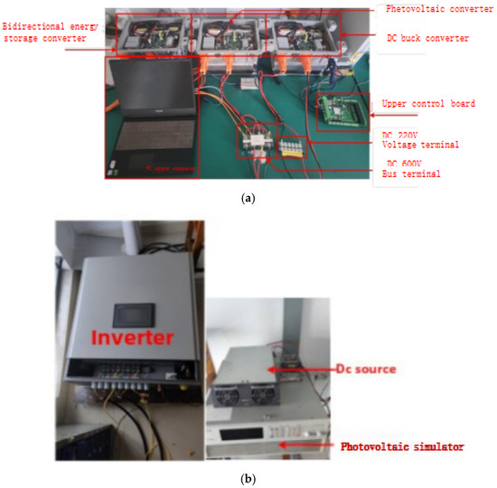 To verify the coordinated control strategy based on DC bus voltage proposed in this chapter, a power router was constructed as shown in Figure 17, where Figure 17a shows three DC-DC converters and other equipment, and Figure 17b shows the inverter, DC source, and photovoltaic simulator.