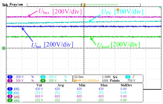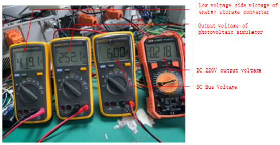 As shown in Figure 18, the voltage waveforms during system operation include the energy storage converter’s low-voltage side voltage, the DC bus voltage, the photovoltaic simulator output voltage, and the DC 220 V voltage. The figure shows that all system voltages remain stable, indicating that system power maintains balance and stability.