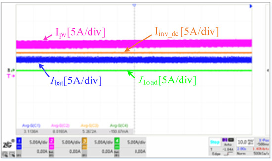 Figure 18 shows system current waveforms, including the energy storage converter’s low-voltage side current, the inverter’s DC-side voltage, the photovoltaic simulator’s output current, and the DC 220 V port’s output current. The voltages in each channel of Figure 18 correspond to the currents in each channel of Figure 19, representing the power at corresponding ports. Data calculations from the figures can be performed, as shown in Figure 19, proving that the system power maintains balance at this time.