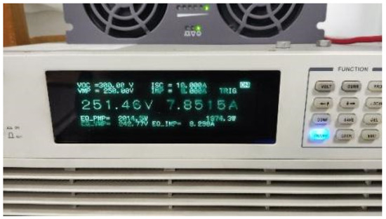 Table 5 shows the photovoltaic simulator parameters, and Figure 20 displays the real-time data interface of the photovoltaic simulator during system operation. The maximum power point voltage is set to 250 V with a current of 8 A, while the actual operation shows values of 251.46 V and 7.8515 A. Deviation in the voltage occurs due to the photovoltaic simulator’s inherent characteristics; when different parameters are set, the simulated photovoltaic characteristics vary, affecting the output results. According to the photovoltaic simulator parameters, the photovoltaic unit is now properly tracking the maximum power point operation, inputting 2 kW of power into the system.