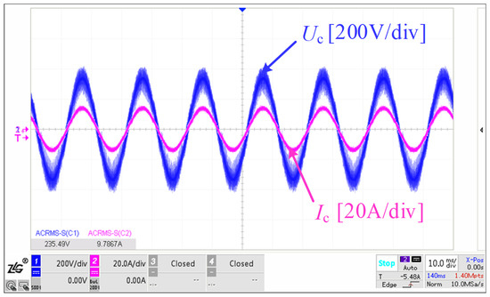Figure 21 shows the voltage and current waveforms of phase C on the inverter’s AC side. The system maintains sinusoidal voltage and current operation, indirectly reflecting system power stability. The inverter’s voltage and current phases are identical, indicating power transfer to the AC grid.