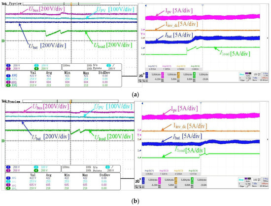 To further verify the system’s stability, Figure 22 shows voltage and current waveforms during loading of the 220 V port. Figure 23a shows waveforms when loading 494 W from no-load conditions at port 3, and Figure 23b shows waveforms when loading 988 W. The dynamic loading process demonstrates that the bus voltage remains stable with minimal fluctuation. The 220 V port shows a noticeable voltage drop when transitioning from no load to a loaded state, due to poorer voltage control performance during low-current no-load conditions compared to loaded conditions. After 220 V port voltage recovery, stable operation is maintained.