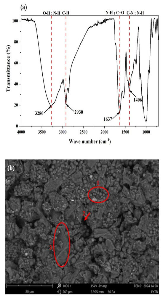 The samples were analyzed using Fourier transform infrared spectroscopy (FT-IR, Nicolet 6700, Thermo-Scientific, Madison, USA), equipped with an attenuated total reflectance (ATR) accessory. A pressure applicator with a rotary knob was employed to compress the samples and enhance contact with the ATR diamond crystal. Infrared radiation from the spectrometer, with a fixed angle of incidence of 45 °C, was reflected through the crystal and penetrated the sample via an evanescent wave. The infrared spectra were processed using the OMNIC Professional 7 software package, which is integrated into the control computer, in the range of 4000 cm−1 to 400 cm−1 [37].