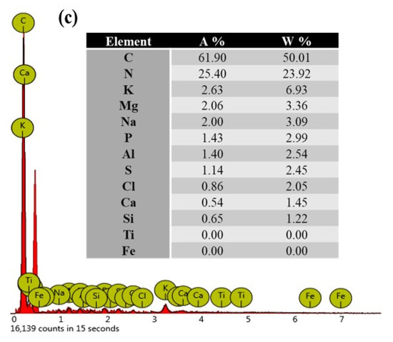 The morphology and microstructures of the samples were analyzed using a scanning electron microscope (SEM, Thermo Scientific Phenom ProX, Eindhoven, The Netherlands) equipped with an EDX analyzer at FOV: 537 µm, Mode: 15 kV—Image, Detector: BSD Full [38].
