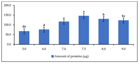 Protein concentration was determined using the Bradford method [32], with bovine serum albumin (BSA) employed as the standard. A stock solution of bovine serum albumin was prepared in distilled water at a concentration of 1 mg/mL. Subsequently, a series of concentrations of standards, commencing with the stock solution, was prepared by cascade dilution (1/2). One hundred microliters (100 µL) of each standard and sample solution was transferred into clean, dry vial tubes. To this solution, 3 mL of Bradford reagent was added and vortexed. The tubes were then incubated at room temperature for a period of 15 min prior to analysis. Subsequently, the absorbance of the BSA and samples was determined by means of a UV-vis spectrophotometer at a wavelength of 595 nm.