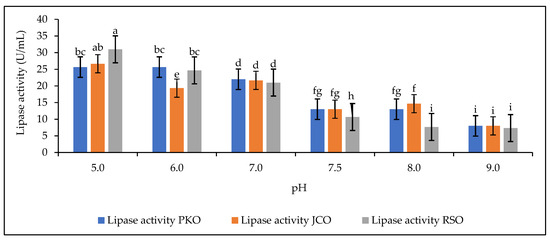 2.6.1. Effect of pH on Lipase Hydrolytic Activity