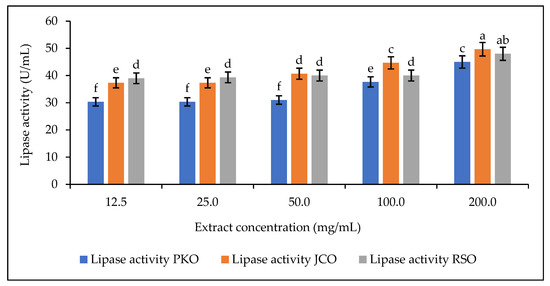 The effect of extract concentration on the hydrolytic activity of plant-derived rubber lipase was investigated by preparing samples of lipase solution in a sodium phosphate buffer (0.2 M, pH 5) at varying concentrations (12.5, 25, 50, 100, and 200 mg/mL). The hydrolytic activity of lipase was then evaluated and calculated in accordance with the methodology outlined in Section 2.5 [33].