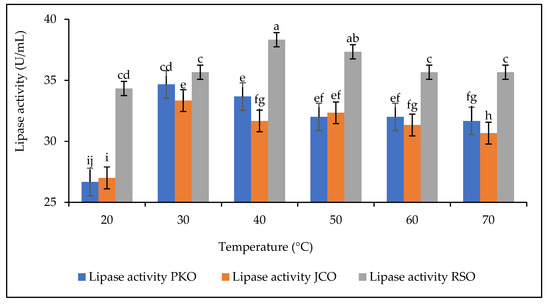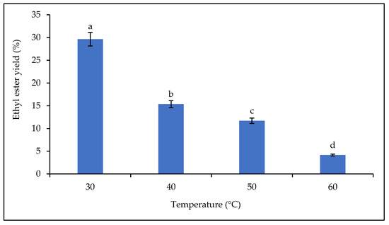 In order to evaluate the effect of temperature on lipase catalytic activity, transesterification reactions were conducted at temperatures of 30 °C, 40 °C, 50 °C, and 60 °C for a period of 48 h. The catalytic activity of lipase was then determined and calculated in accordance with the methodology outlined in Section 2.7 and Section 2.10.