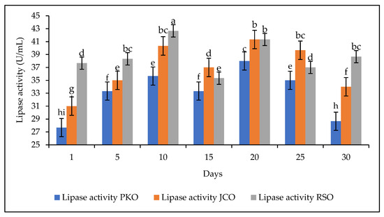 The storage stability of the lipase was investigated by storing it at 4 °C for 30 days. At 5-day intervals, 1 mL samples of the lipase solution were taken to determine its hydrolytic activity [34,35]. The hydrolytic activity of lipase was tested and calculated according to the procedure and formula given in Section 2.5 [33].