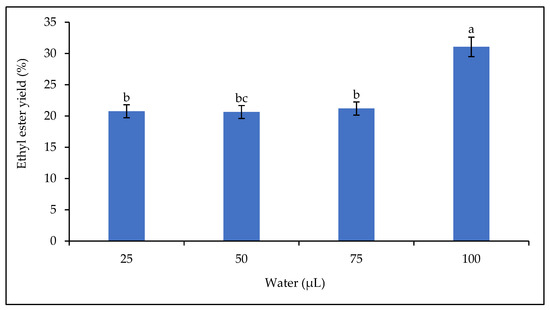Effect of water on the ethyl ester yield. Letters show statistical significance between mean.