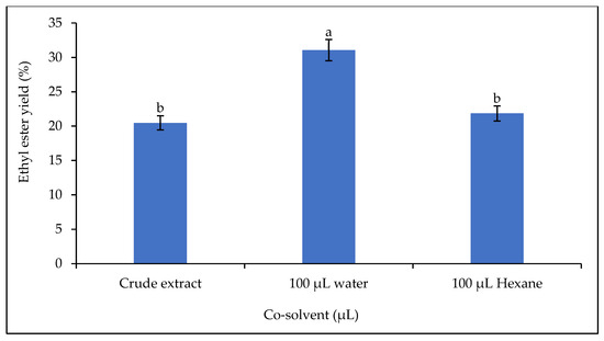 Effect of co-solvent on the ethyl ester yield. Letters show statistical significance between mean.
