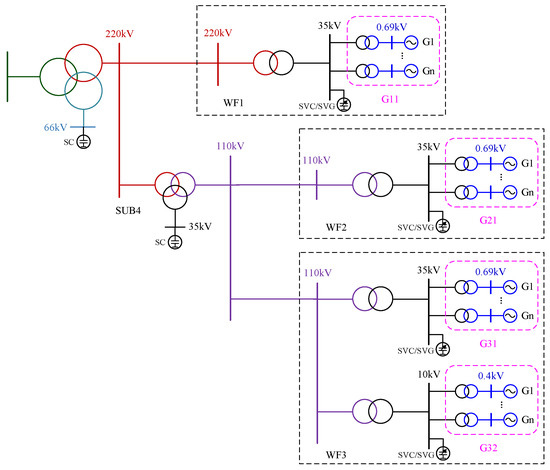 The typical one-line diagram of a renewable energy base is shown in Figure 1 [15,16]. WF1, WF2, and WF3 are three renewable energy stations. The typical voltage levels of renewable energy units are 0.69 kV/0.4 kV. These units are grouped and connected to 10 kV/35 kV buses through step-up transformers at the generator terminals. The voltage is then further stepped up to the 110 kV/220 kV main bus of the renewable energy station before being connected to the renewable energy collection station. Since individual renewable energy units have relatively small capacities, and multiple units connected to the same 10 kV/35 kV bus are often of the same type, this paper aggregates multiple small-capacity renewable energy units connected to the same 10 kV/35 kV bus into a single entity, represented by one decision variable.