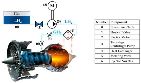 In a recent research study, a potential architecture for an innovative aircraft fuel system using H2 as fuel was proposed [,]. This system, which was developed based on conventional layouts [], is illustrated in Figure 1.