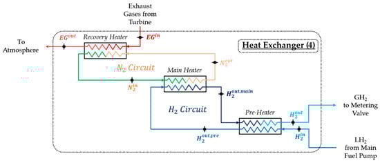 - Pre-Heater: LH2 from the main fuel pump enters the heat exchanger ) and flows into the third subunit, the pre-heater. Within this subunit, high-temperature GH2 from the main heater () transfers a part of heat to the incoming LH2, causing its vaporisation. After this process, the GH2 from the main heater exits the pre-heater at a slightly reduced temperature () and is ready to flow toward the metering system under the required thermodynamic conditions.